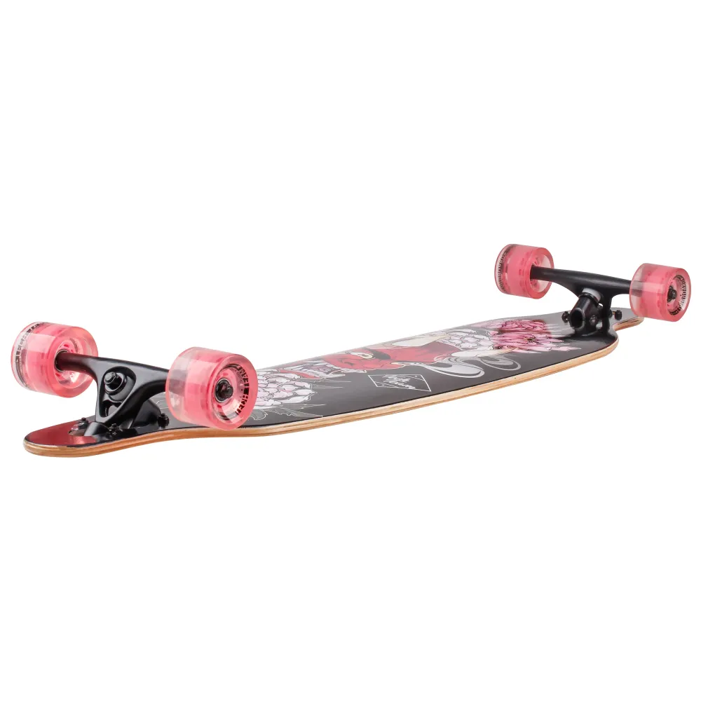 Дека имеет размеры 41 дюйм. Покрыта нескользящей брендовой шкуркой. Верхняя часть обозначена фирменным принтом. 7-дюймовая подвеска из высокопрочного алюминия качественная, проверена многочисленными отзывами райдеров. Колеса диаметром 70 мм, шириной 51 мм и параметрами жесткости 82А изготовлены из нестираемого долговечного материала. Вместе с подшипниками ABEC 7 CHROME и бушингами жесткостью 95 А езда превращается в удовольствие. Технические параметры модели позволяют развлекаться и маневрировать. Для заказа лонгборда предлагаем связаться с менеджером интернет-магазина.