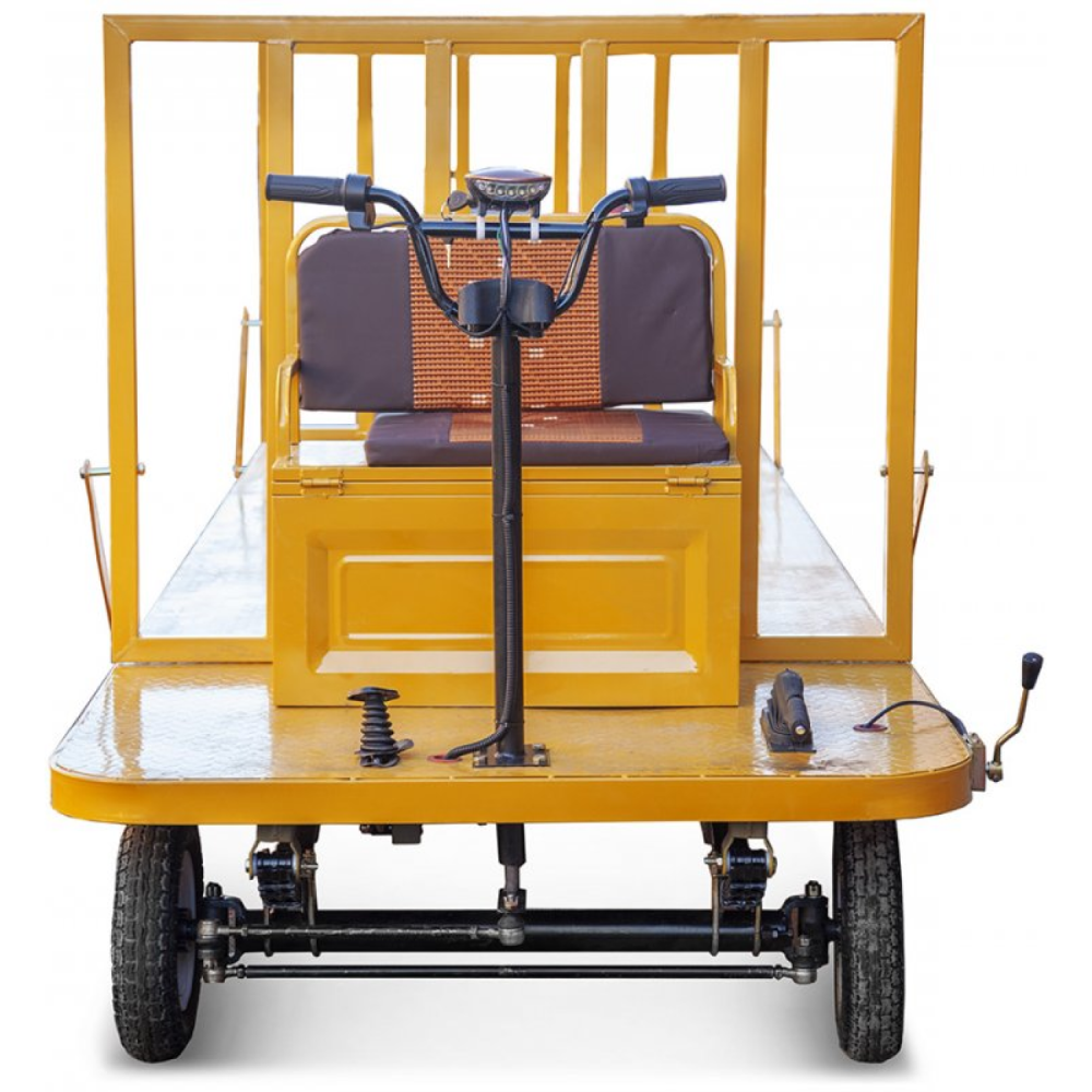 Оснащенность модели бесщеточным редукторным электродвигателем мощностью 1800 Вт и емкой батареей на 32 А*ч позволяют разогнаться до скоростных показателей 25 км/час и преодолеть расстояние до 30 км. Стальная конструкция кузова оснащена высокими съемными бортами, увеличивающими степень практичности техники, исключающими случайное падение груза и другие форс-мажорные ситуации. При максимальной загруженности – до 1000 кг тележка может двигаться на минимальных передачах.