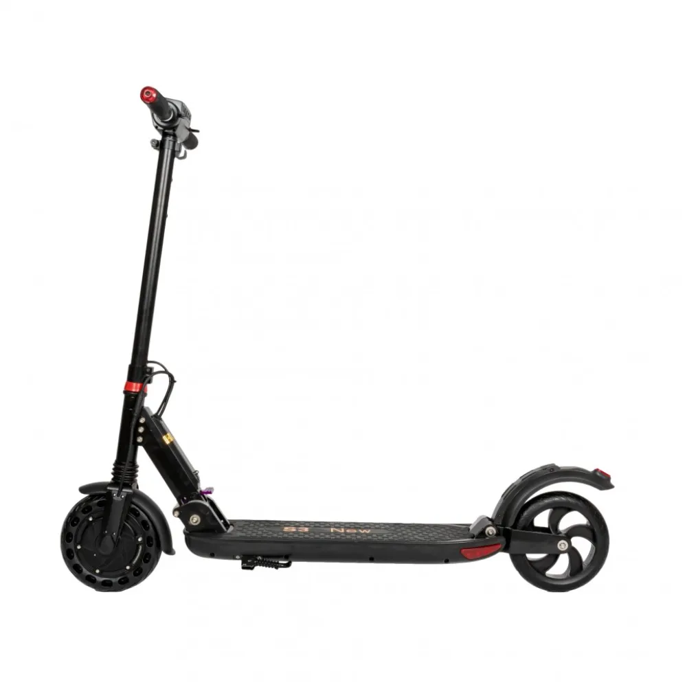 Электросамокат AOVO S3 NEW ЧЕРНЫЙ - надежное средство передвижения по городским улицам. Производительный мотор мощностью 350 Вт обеспечивает уверенный разгон и преодоление подъемов с углом наклона до 30 градусов. На ровной дороге электросамокат развивает скорость до 35 км/час. 8-дюймовые колеса оснащены пластиковыми крыльями, которые защищают райдера от попадания брызг во время движения в неблагоприятных погодных условиях. Яркая передняя фара и задний стоп-сигнал делают электросамокат заметным для других участников движения и обеспечивают безопасное управление в темное время суток. Емкости аккумулятора достаточно для преодоления 25 километров на одном полном заряде батареи. Все детали самоката тщательно продуманы и отвечают требованиям безопасности. Телескопическая рулевая стойка позволяет настраивать высоту руля под рост пользователя. Резиновые грипсы эргономичной формы обеспечивают удобное положение рук без скольжения. Широкая платформа для ног имеет специальное наждачное покрытие, благодаря которому райдер сохраняет устойчивость во время активного движения и маневрирования. Электросамокат оснащен бортовым компьютером, данные с которого отображаются на крупном электронном дисплее. Благодаря простому складному механизму AOVO S3 NEW приобретает компактные размеры и может легко транспортироваться в багажнике автомобиля или общественном транспорте.