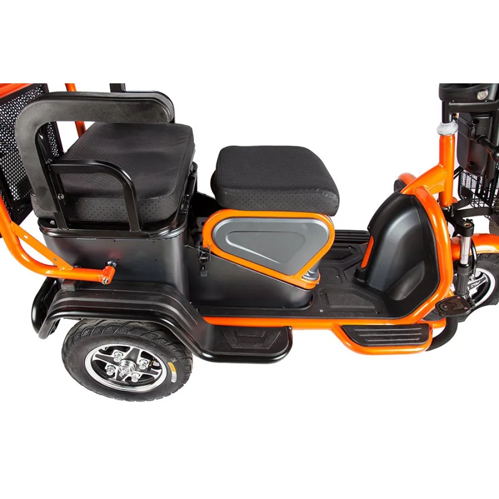 Повышенная устойчивость объясняется широкими колесами с протекторным рисунком для лучшего прохождения тс по неровной дороге. Модель обработана специальным сверхпрочным покрытием, надежно защищает от повреждения металла коррозией и различных деформаций. Максимальное прохождение расстояния на одном заряде обеспечивается долговечным аккумулятором электротрицикла. Приятной неожиданностью пользователю станет наличие охранной сигнализации с фирменными брелоками для защиты от угона.