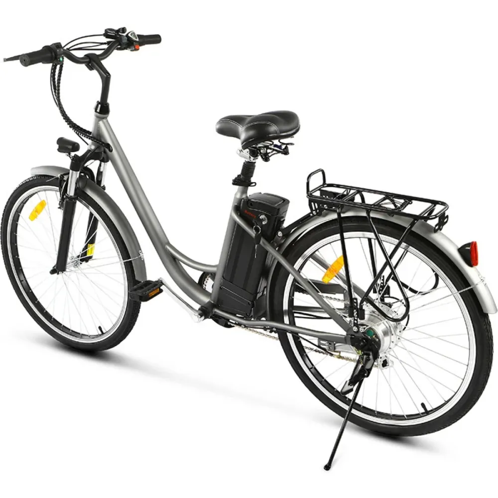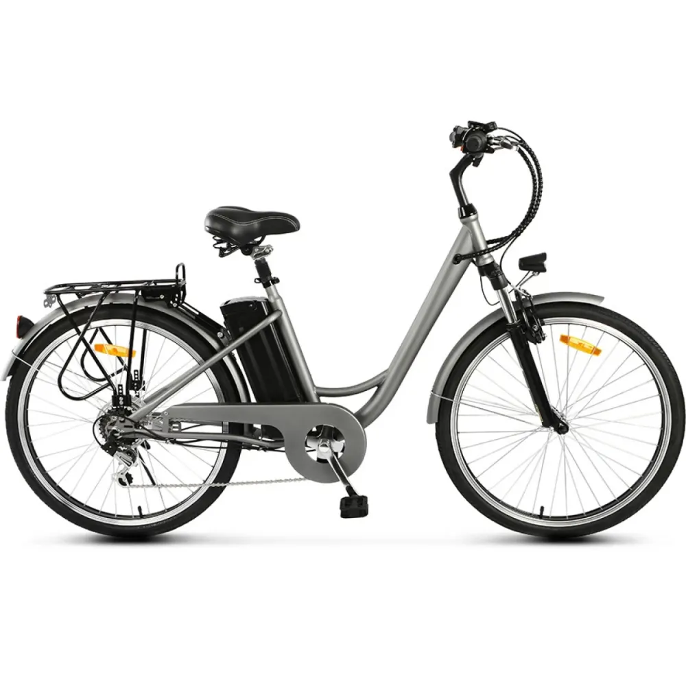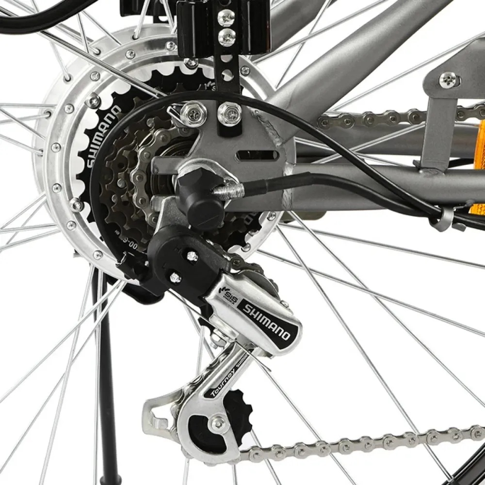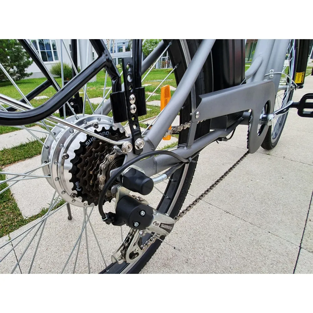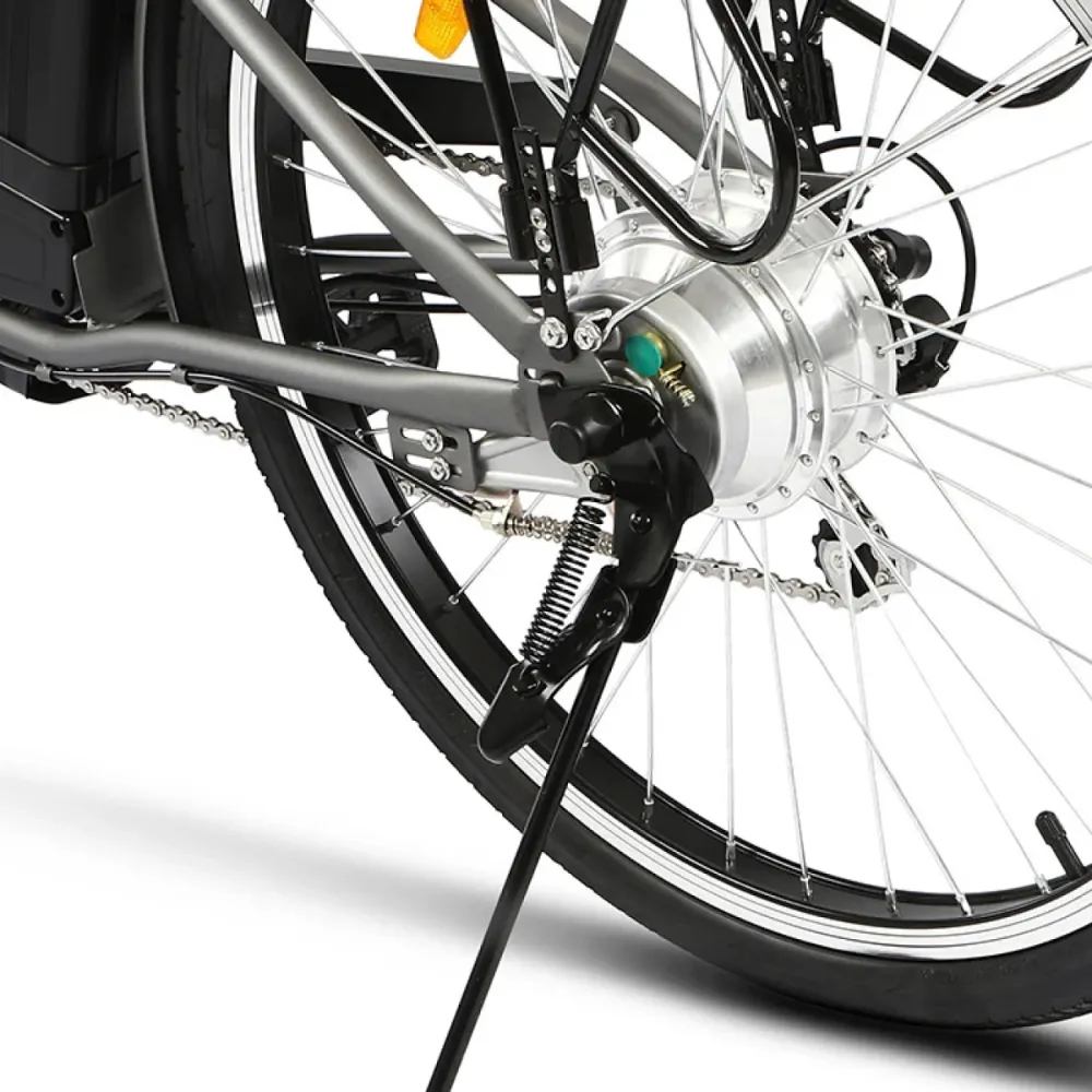 Техника оборудована 26-дюймовыми колесами техника выглядит круто в сравнении с другими моделями. Максимальная грузоподъемность составляет 120 кг. Мощное мотор-колесо в 250 Вт вместе с литий-ионным быстросъемным аккумулятором гарантирует продолжительное путешествие на протяжении 35 км. Максимальная скорость составляет 25 км/час.